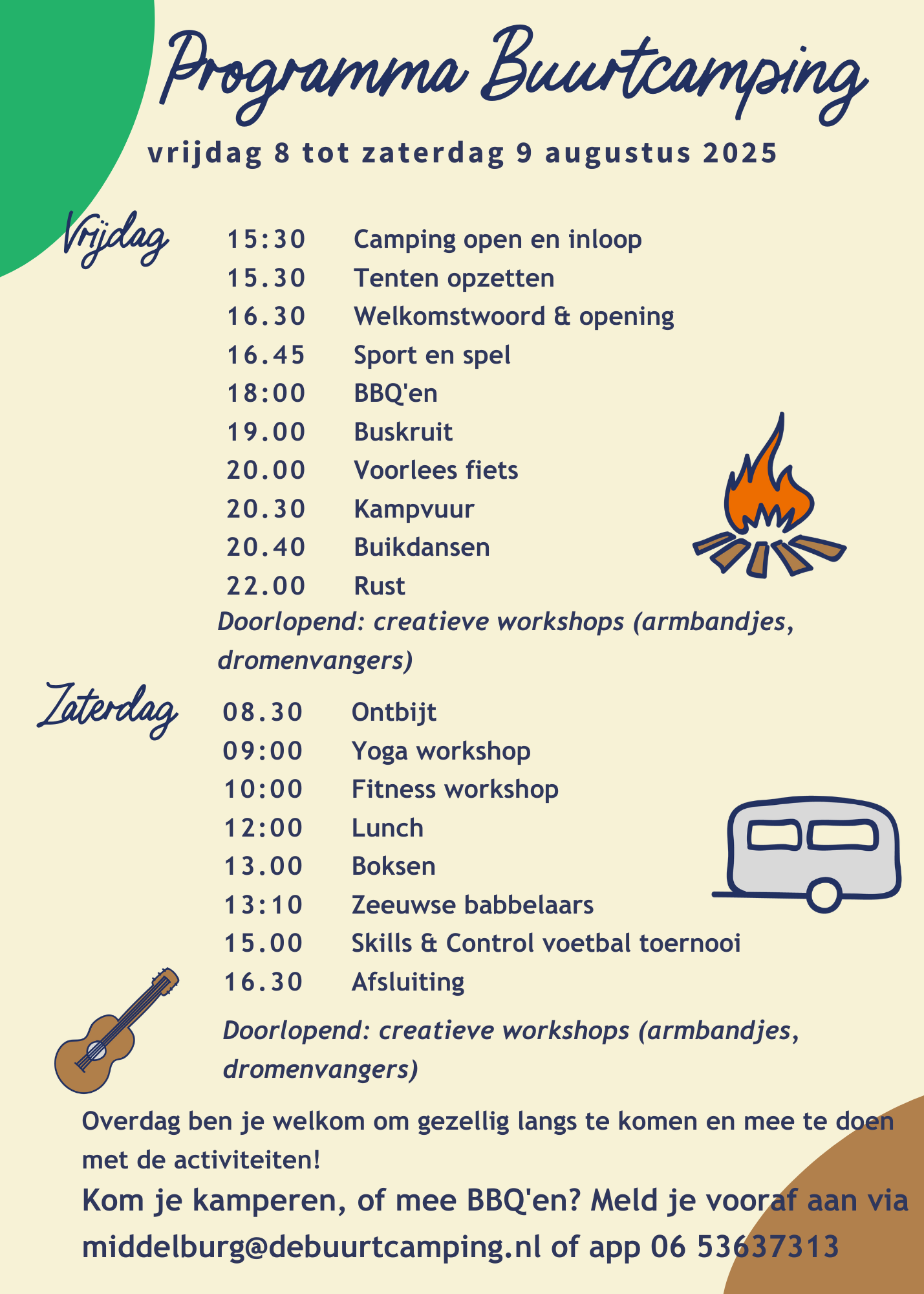 Wil je erbij zijn? Bestel dan vanaf 30 juni je kaartje via de gele knop aan de rechterkant van deze pagina. Je kunt ook mailen naar middelburg@debuurtcamping.nl of app/bel 06-53637313